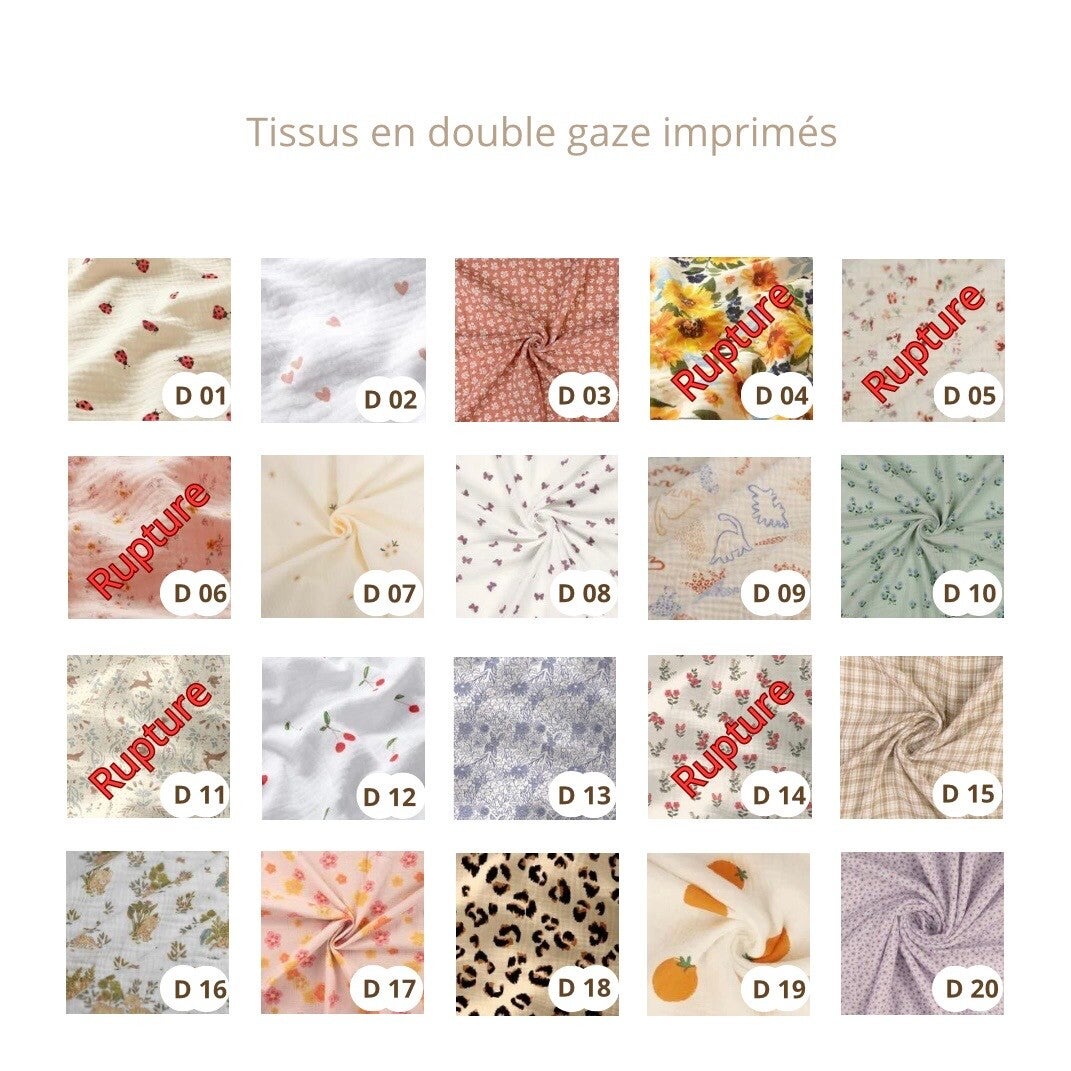 Nous faisons au mieux pour régulièrement mettre à jour les tissus disponibles et de vous informer des ruptures de stock, mais il se peut qu'avec une grande vague de commandes simultanées, vous choisissez un tissu que nous n'avons plus.